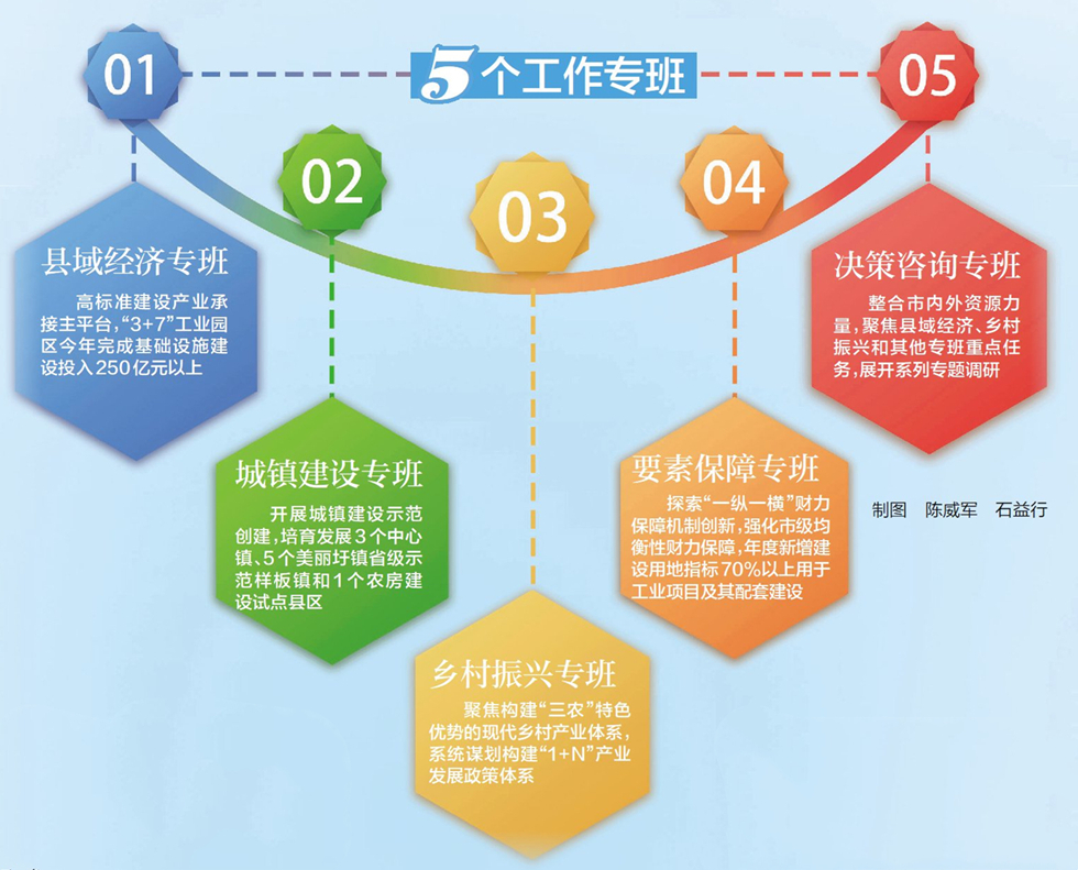 對標省“百千萬工程”重點任務,我市成立縣域經(jīng)濟、城鎮(zhèn)建設、鄉(xiāng)村振興、要素保障、決策咨詢5個專班,開展黨建引領敢為敢闖敢干敢首創(chuàng)示范、縣城綜合承載力提升、千億產(chǎn)業(yè)園基礎設施補短板、中心鎮(zhèn)專業(yè)鎮(zhèn)特色鎮(zhèn)創(chuàng)強培優(yōu)、農(nóng)村人居環(huán)境鞏固優(yōu)化、城鄉(xiāng)流通網(wǎng)絡暢通等六大攻堅行動。