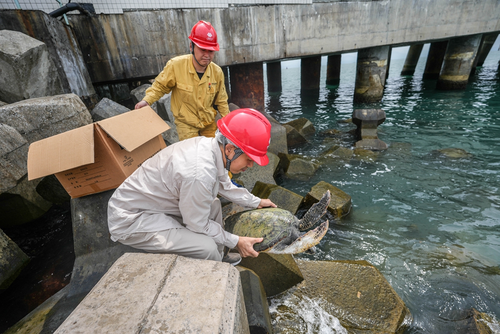 近日,一只綠海龜誤入國能惠州電廠廠區(qū)水池,行動受困,該廠工作人員發(fā)現(xiàn)后成功救助起受困海龜,幫助其順利回歸大海,以實際行動保護(hù)野生動物,守護(hù)海洋生態(tài)。