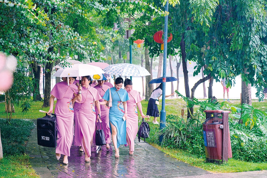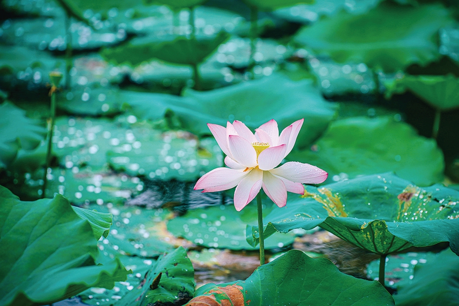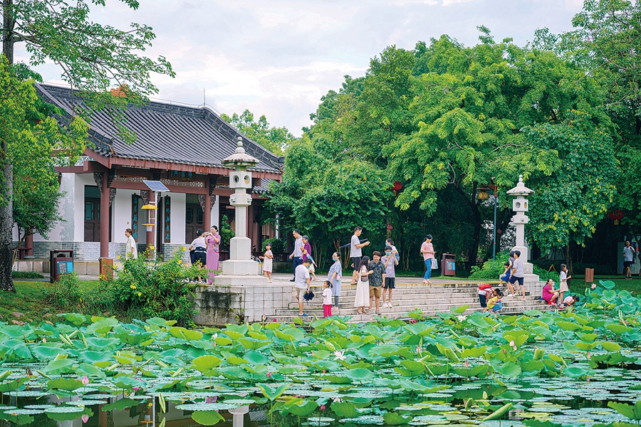 “映湖光,逞新妝。”西湖畔的豐渚園夏日風景漸入佳境,見淵亭橋附近的荷花已展風姿,園內(nèi)處處被綠色裝點,引人入勝。