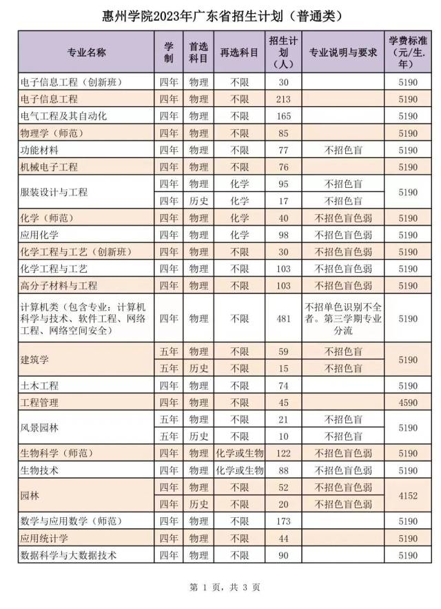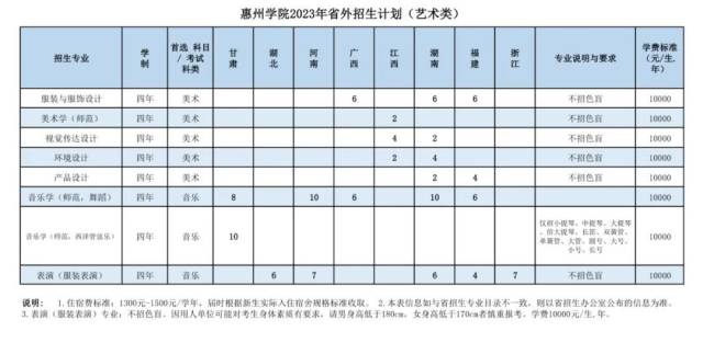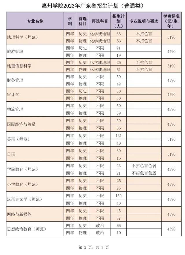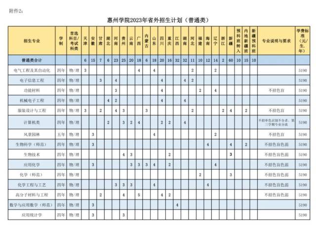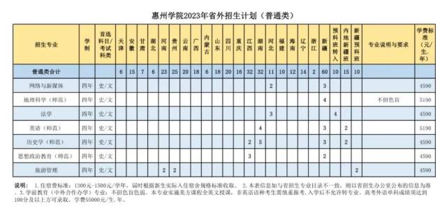 在廣東省,惠州學院在普通類(物理)計劃招3006人,普通類(歷史)計劃招1143人,美術(shù)類計劃招252人,音樂類計劃招150人,體育類計劃招200人。