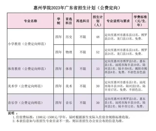 今年惠州學院教師專項(公費定向)培養(yǎng)招生計劃招193名,含小學教育專業(yè)100名、體育教育專業(yè)33名、音樂學專業(yè)30名、美術(shù)學專業(yè)30名。