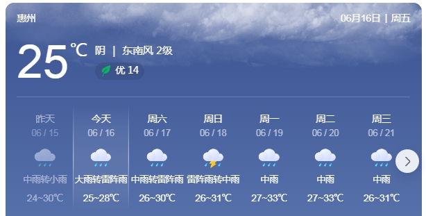 惠州日報訊 (記者周智聰 通訊員惠氣象宣)惠州市氣象臺6月15日17時20分發(fā)布惠州天氣實況及預(yù)報,預(yù)計未來三天我市仍有較明顯降水,并伴有短時強降水、雷暴等強對流天氣。