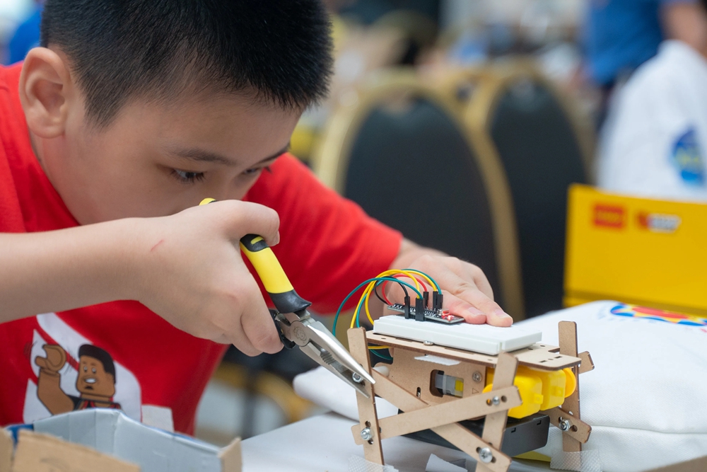 選手們?cè)谥谱鹘M裝機(jī)器人。