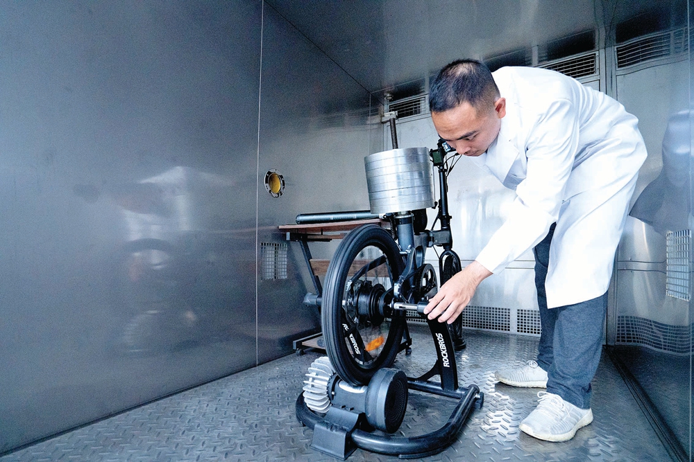 工作人員在產(chǎn)品測試車間檢測自行車。