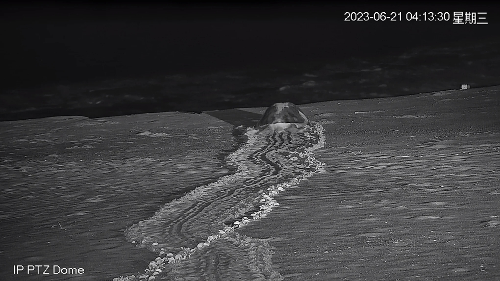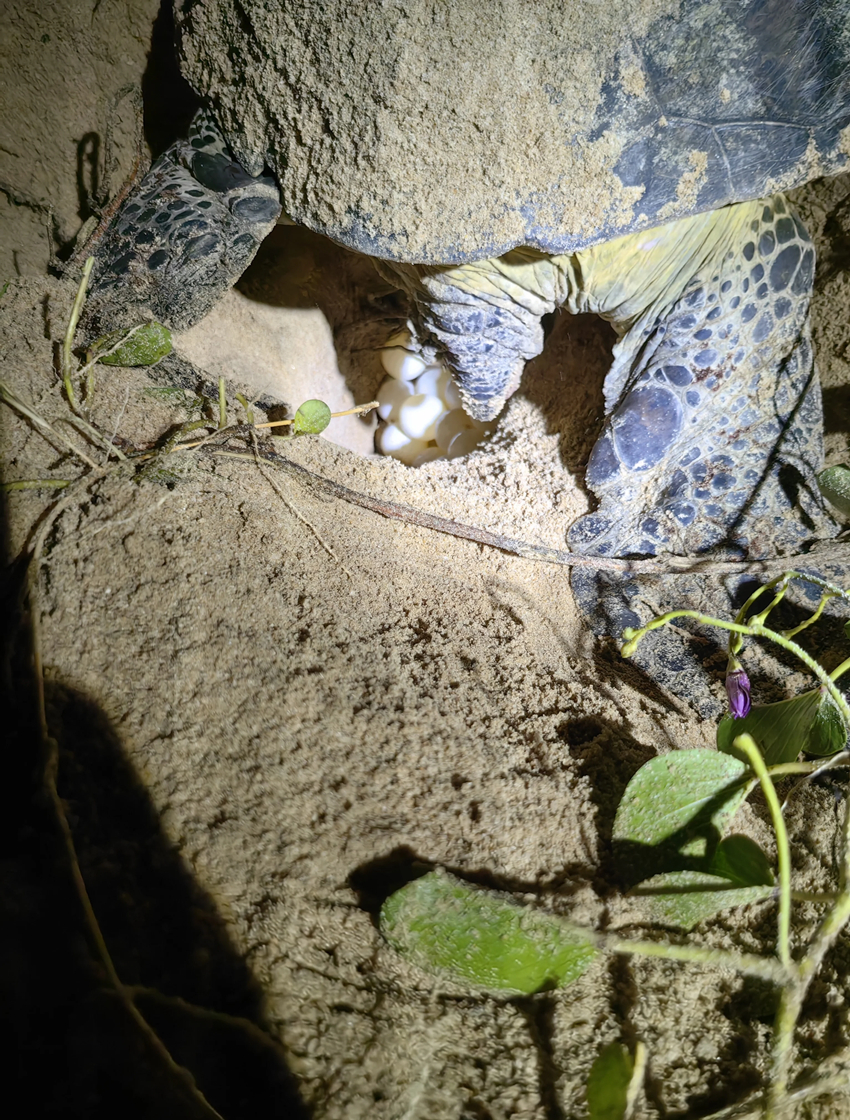 當(dāng)天凌晨,母海龜從海里悄悄爬上沙灘,用健壯的四肢在沙灘上挖了個坑,趴著產(chǎn)下一窩龜?shù)昂,又悄悄往海里爬去?時30分消失在浪潮里。