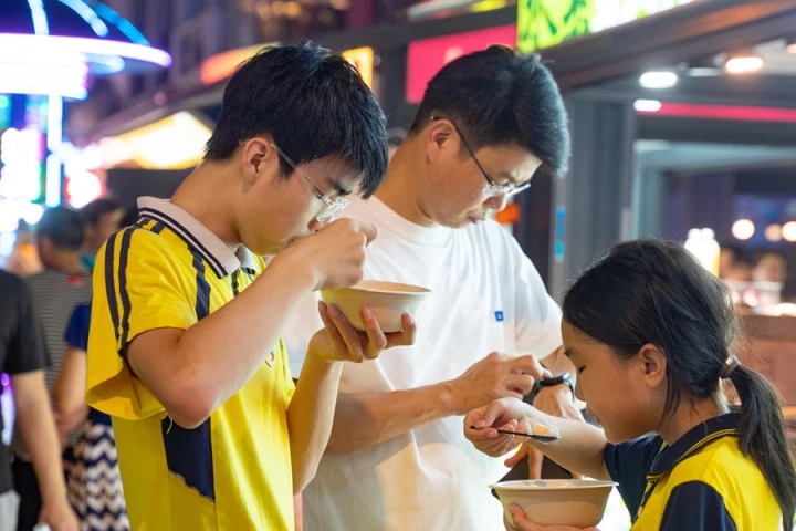 走進(jìn)集市,一股喜慶而熱鬧的氣氛撲面而來。一位身穿華美漢服的女子手持扇子,在古色古香的亭臺(tái)下翩然起舞,曼妙的舞姿吸引了眾多觀眾。不遠(yuǎn)處,一群孩子手拿東坡文創(chuàng)雪糕,笑聲響亮,他們?cè)跉g樂的氛圍中享受著東坡文化與美食的雙重盛宴。