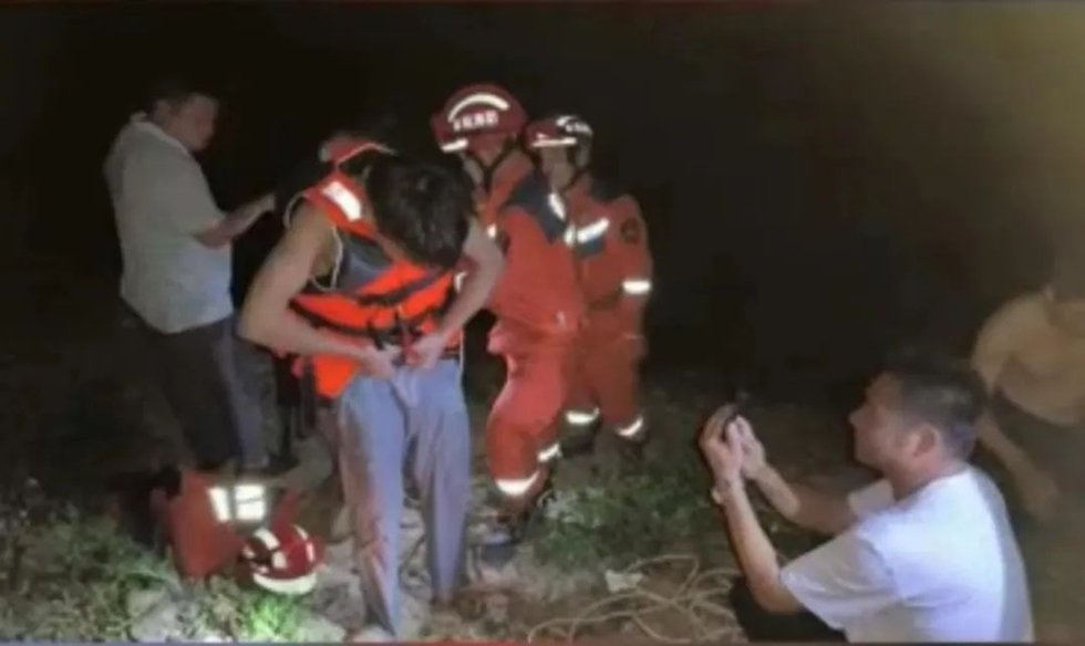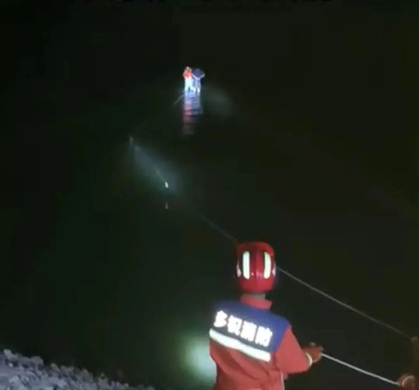 指揮員了解完情況后馬上前往河上游與開閘負(fù)責(zé)人溝通后暫時(shí)關(guān)閉放水,隨后等水位下降后,消防員帶上救生衣和繩索,將被困人員救回岸上。