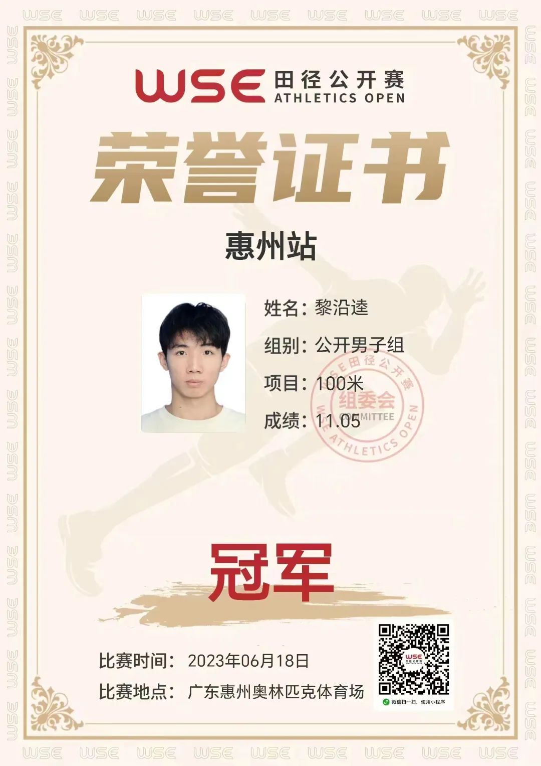 近日,2023中國大眾達標(biāo)系列賽暨WSE田徑公開賽(惠州站)在惠州市奧林匹克體育中心體育場舉辦;葜葸\動員黎沿逵在公開組100m、200m賽事斬獲金牌,并達國家一級運動員標(biāo)準(zhǔn)。