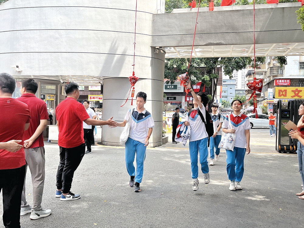 在惠州市第八中學(xué)考點(diǎn),老師們身著紅色上衣,在校門口分列迎接考生。學(xué)校還在校門口懸掛寓意“一舉高中”的粽子,每位考生經(jīng)過都摸一下,討個(gè)好彩頭。老師們還逐一與考生擊掌,為他們加油打氣。