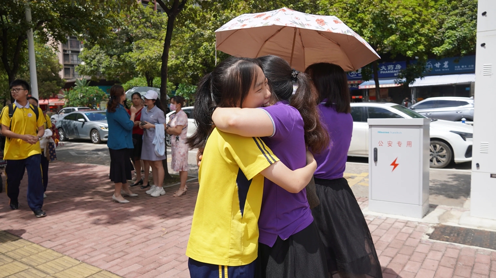 惠州市惠城區(qū)金石學(xué)校老師在考點(diǎn)外與考生擁抱。