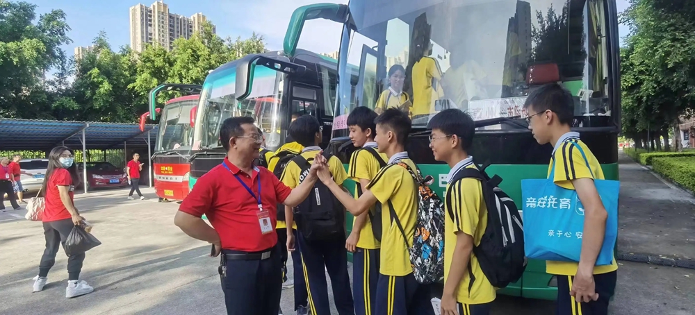 惠州市合生實(shí)驗(yàn)學(xué)校的考生們今年在惠州市惠城區(qū)尚書實(shí)驗(yàn)學(xué)?键c(diǎn)考試。昨日,學(xué)校特意安排了幾輛大巴車,將考生們集體送往考點(diǎn)!凹佑!”出發(fā)前,學(xué)校領(lǐng)導(dǎo)和老師們統(tǒng)一身穿紅色衣服,排隊(duì)一一與每一位考生擊掌,為他們加油打氣。