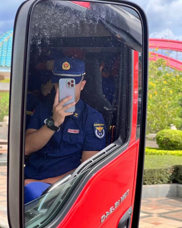 為打消店家的顧慮并取得其信任,期間該男子還發(fā)來(lái)一張身穿消防服裝,坐在消防車上的自拍“照騙”!