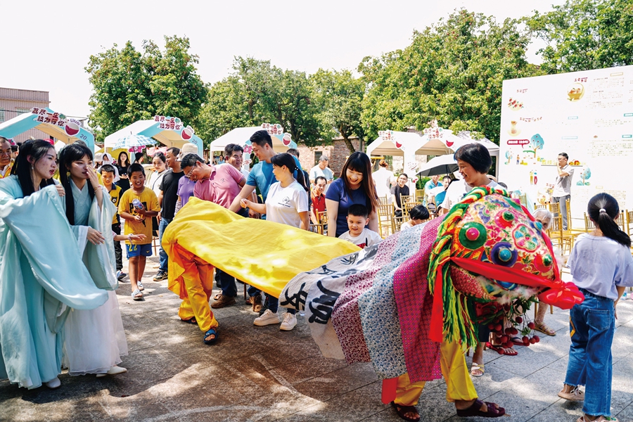 蘆洲鎮(zhèn)蘆村荔枝公園的百年古樹下人頭攢動(dòng),客家傳統(tǒng)麒麟舞伴隨著喧鬧的鑼鼓聲,歡快地在公園各處造勢舞動(dòng),F(xiàn)場還有創(chuàng)意十足的荔枝花束和特色茶飲,為古樹荔枝賦予全新的活力。以荔枝為主元素的活動(dòng)吸引了一大批村民與游客駐足參與,獨(dú)具特色的八角方桌上擺放的蘆洲特色農(nóng)產(chǎn)品讓人目不暇接。