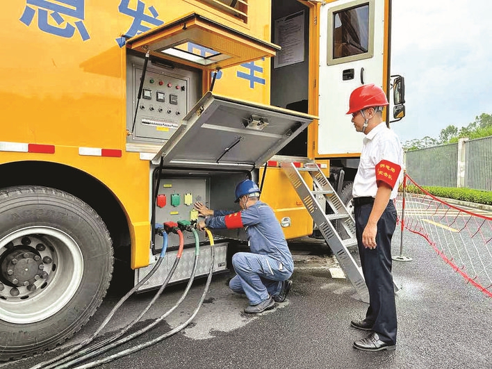 惠州供電局工作人員在現(xiàn)場(chǎng)檢查供電設(shè)備。