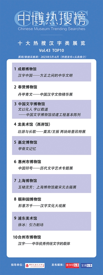中國(guó)文字的力量,一字一世界,一筆一乾坤。筆畫(huà)之間,盡顯文字之美。中博熱搜榜今日發(fā)布最新一期(第43期)“十大熱搜漢字主題展覽推介(中博熱搜榜Vol.43)”,本期推介展覽為2023年5-6月以來(lái)受到全國(guó)網(wǎng)友關(guān)注的十大博物館、美術(shù)館漢字主題展覽。