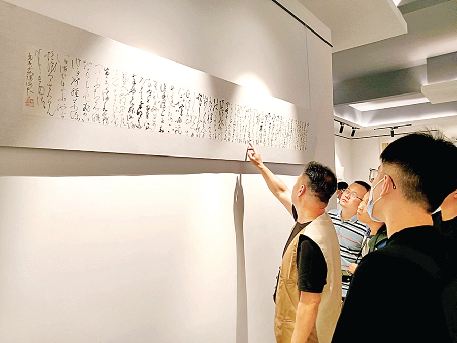 參加活動的書法家和書法愛好者們一邊參觀一邊學習。