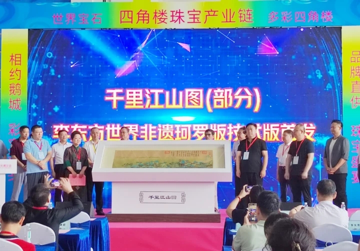 6月30日上午,惠州市珠寶玉石行業(yè)協(xié)會(huì)主辦的2023惠州珠寶玉石文化展覽會(huì)在惠州會(huì)展中心開幕,惠州四角樓珠寶創(chuàng)意園一款名為“唐世緣”的天然礦物顏料亮相,同時(shí),國家高級(jí)工藝美術(shù)師、珂羅版技術(shù)傳承人李東方使用天然礦物顏料“復(fù)活”的《千里江山圖》(局部)正式首發(fā),色彩鮮艷,讓人眼前一亮。