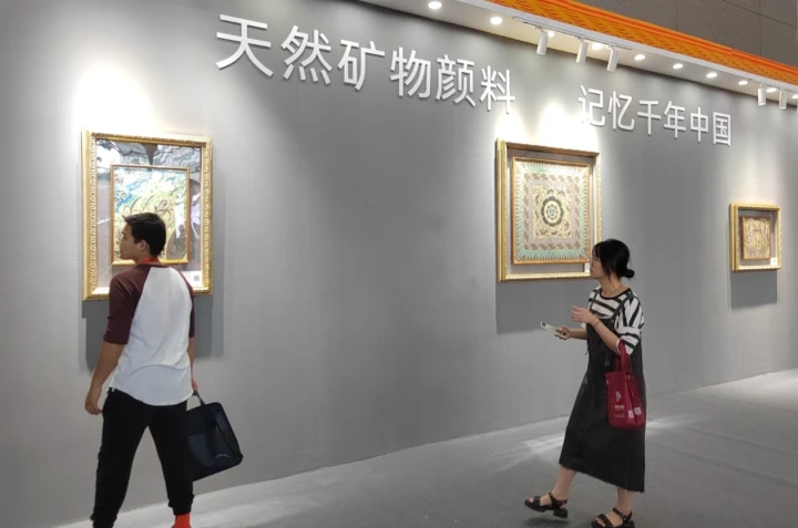 記者留意到,展覽會(huì)現(xiàn)場(chǎng)設(shè)有“天然礦物顏料 記憶千年中國”畫展、“溯源重生”邱楚蓮巖彩畫藝術(shù)作品展,所展出的數(shù)十幅繪畫,均使用惠州所產(chǎn)的天然礦物顏料,彩畫與彩色寶石互相輝映。