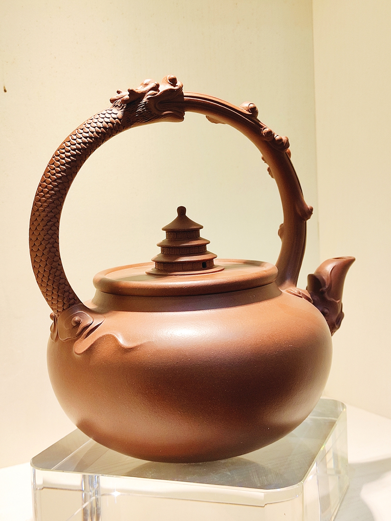 作為中華優(yōu)秀傳統(tǒng)文化的愛(ài)好者和傳播者,張德華把詩(shī)文書(shū)畫與紫砂壺陶藝結(jié)合起來(lái),用竹刀在壺上題寫詩(shī)文、雕刻繪畫,他甚至即興設(shè)計(jì)了許多款式獨(dú)特的紫砂壺。2019年,他設(shè)計(jì)創(chuàng)作的《盛世中華》提梁壺,是以龍為圖騰,壺蓋以天壇為造型,壺梁為龍吟納水,梁上隱約紅日,茶水由龍嘴而出,形似瀑布,寓意國(guó)家繁榮昌盛,中華文脈傳承天下。
