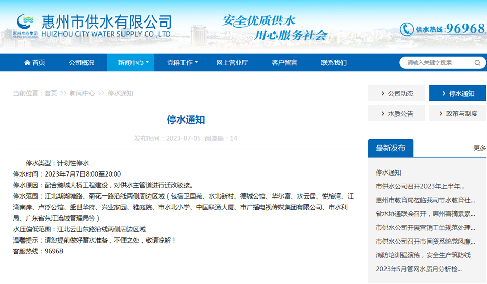 停水時間:2023年7月7日8:00至20:00