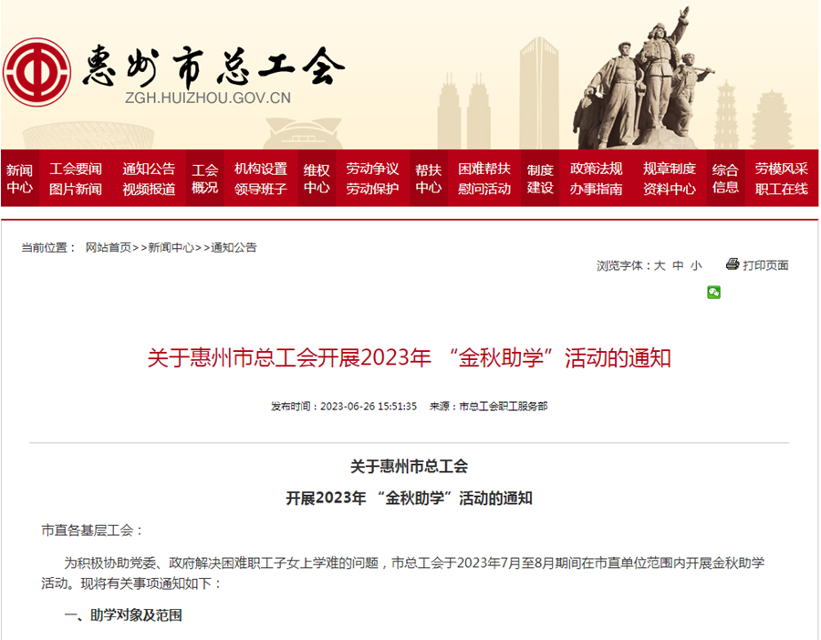 惠州日?qǐng)?bào)訊 (記者馬海菊)記者從市總工會(huì)獲悉,為積極協(xié)助黨委、政府解決困難職工子女上學(xué)難的問題,市總工會(huì)啟動(dòng)2023年“金秋助學(xué)”活動(dòng),助學(xué)對(duì)象為就讀中專、大專以上院校的市直單位困難職工家庭子女,符合條件的困難職工7月20日前可向所在單位基層工會(huì)提出申請(qǐng)。