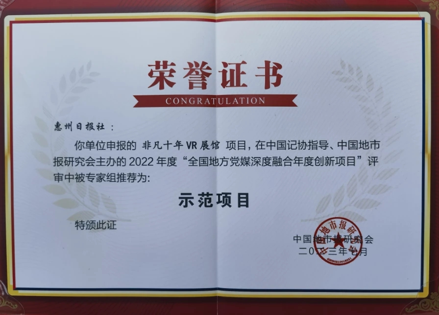“惠州非凡十年”VR展館入選2022年度“全國(guó)地方黨媒深度融合年度創(chuàng)新項(xiàng)目”示范項(xiàng)目。該項(xiàng)目融合創(chuàng)新技術(shù),創(chuàng)新運(yùn)用VR技術(shù)打造云展館。以3D立體場(chǎng)景突破時(shí)間、地域、場(chǎng)地的局限,全方位展現(xiàn)惠州十年發(fā)展成就,更具互動(dòng)感、現(xiàn)場(chǎng)感,讓觀眾體驗(yàn)與互聯(lián)網(wǎng)技術(shù)的創(chuàng)新融合。