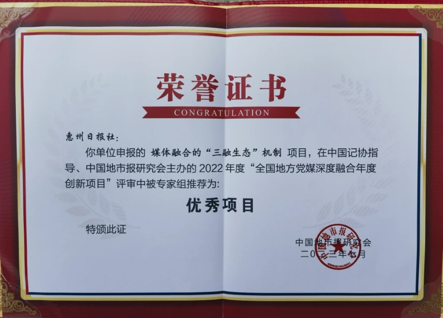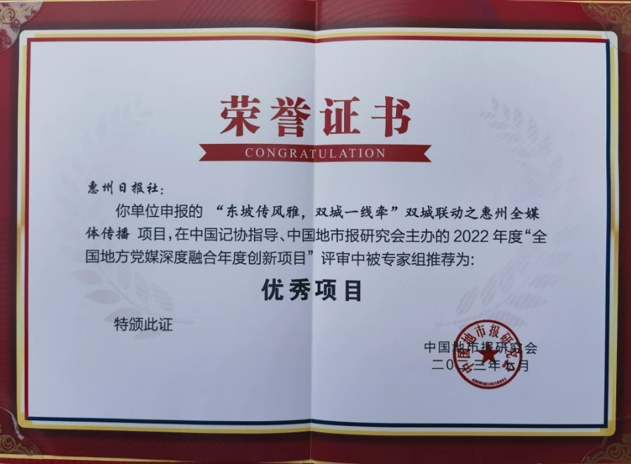“東坡傳風(fēng)雅,雙城一線牽”雙城聯(lián)動(dòng)入選2022年度“全國(guó)地方黨媒深度融合年度創(chuàng)新項(xiàng)目”優(yōu)秀項(xiàng)目。該項(xiàng)目以東坡為紐帶,惠州日?qǐng)?bào)、眉山日?qǐng)?bào)聯(lián)動(dòng),全媒體平臺(tái)共發(fā)布相關(guān)稿件125篇,總閱讀量超780萬,共39萬名網(wǎng)友“云賞”兩地美景。宣傳形式新、傳播效果強(qiáng)。