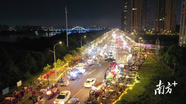 在惠城區(qū)沿江路一帶,攤販們的小推車沿街一字排開。從空中俯瞰,各個攤位在漆黑的夜晚形成一條閃亮的燈帶,原本開闊的道路突然顯得狹窄。