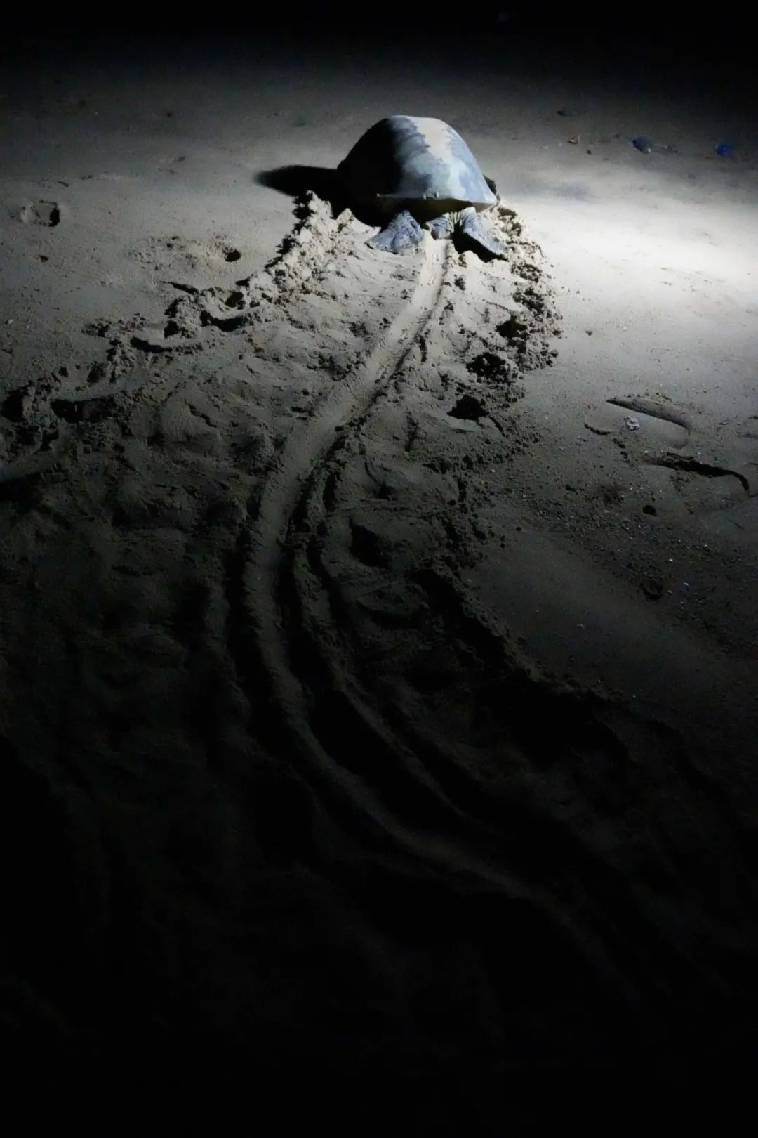 海龜媽媽緩慢爬行,在沙灘上留下的痕跡像坦克車轍。