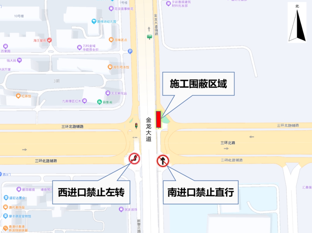 施工期間,金龍大道/三環(huán)北路輔路交叉口北出口封閉,西進口禁止左轉,南進口禁止直行。