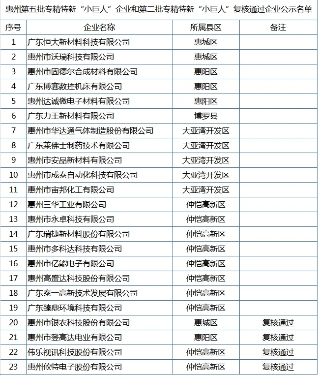 惠州第五批專精特新“小巨人”企業(yè)和第二批專精特新“小巨人”復(fù)核通過(guò)企業(yè)公示名單。