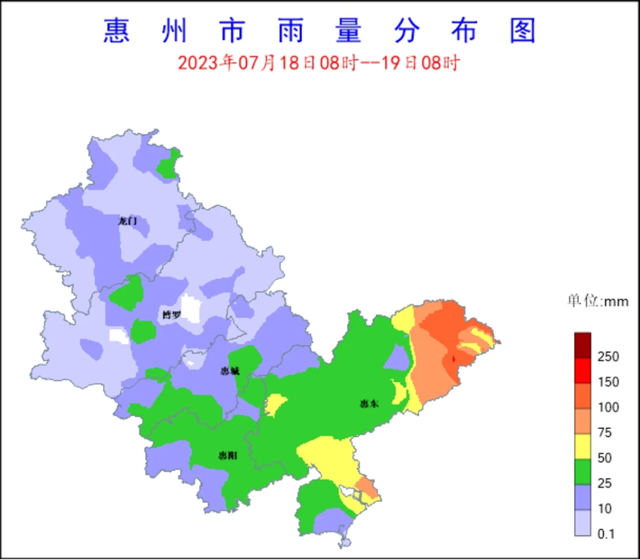 市氣象臺介紹,7月18日8時~19日8時,我市南部有大雨到暴雨局部大暴雨,中北部有中到大雨局部暴雨,全市平均雨量21.4毫米,有3個站點(diǎn)錄得100~250毫米累積雨量,有10個站點(diǎn)錄得50~100毫米累積雨量,有45個站點(diǎn)錄得25~50毫米累積雨量,各縣區(qū)最大降水量分別為:惠東高潭153.1毫米、惠城河南岸51.7毫米、大亞灣澳頭47.3毫米、惠陽沙田42.1毫米、仲愷潼僑37.3毫米、博羅湖鎮(zhèn)26.9毫米、龍門龍?zhí)?6毫米。