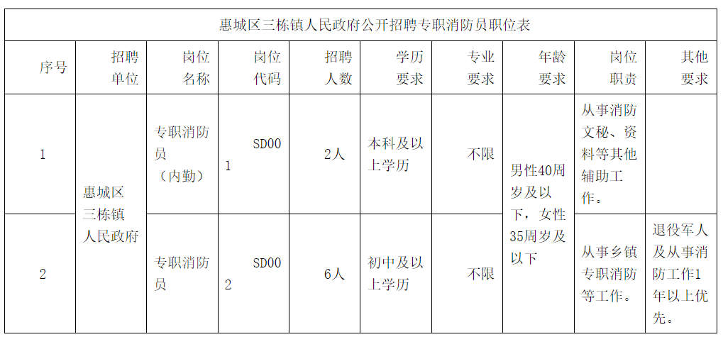 1、惠城區(qū)三棟鎮(zhèn)人民政府招聘專職消防員