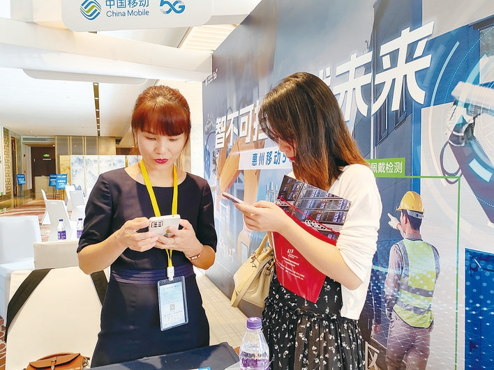惠州移動公司工作人員向與會人員講述5G網(wǎng)絡推動企業(yè)數(shù)字轉(zhuǎn)型上的優(yōu)勢。
