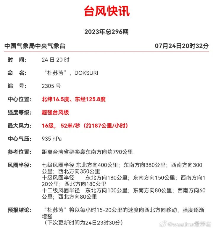 惠州市氣象臺7月24日14時40分發(fā)布惠州重大氣象信息,今年第5號臺風(fēng)“杜蘇芮”7月24日08時已加強(qiáng)為強(qiáng)臺風(fēng)級,11時中心位于我市惠東縣港口鎮(zhèn)東南方向約1430公里的菲律賓以東洋面上,中心最大風(fēng)力15級(48米/秒)。預(yù)計,“杜蘇芮”將以10到15公里的時速向偏西北方向移動,趨向巴士海峽和臺灣南部海面,強(qiáng)度繼續(xù)加強(qiáng),最強(qiáng)可達(dá)超強(qiáng)臺風(fēng)級(16級~17級)。