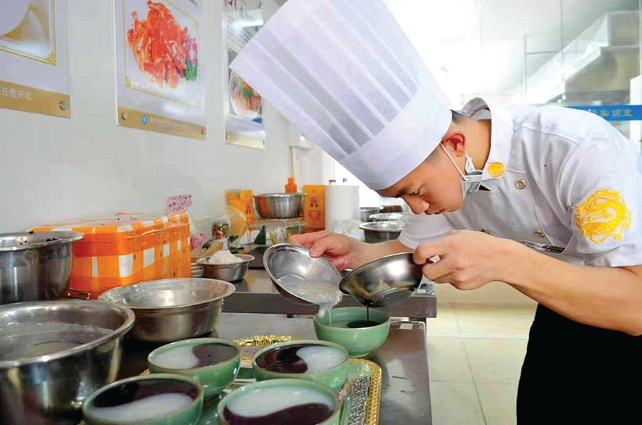 中考失利曾一度讓楊勝文看不到未來,沒有機會上高中,他選擇上技工學校,并報讀了惠州市博賽技工學校的烹飪專業(yè)!斑x這個專業(yè)主要是我對吃很感興趣!蹦サ、拋鍋是楊勝文學習到的第一個技能,這也是專業(yè)里最基本的技能,幾乎每天都要練習。“學校管理很嚴格,我們的教室就像酒店的后廚!甭,楊勝文在專業(yè)學習上越來越深入,老師的教導加上自己的努力,他在校期間就已參加了很多技能比賽,還取得不錯的成績,曾獲第二屆粵港澳大灣區(qū)“粵菜師傅”技能比賽中式烹調師(新秀組)項目第三名、惠州市“粵菜師傅”烹飪職業(yè)技能競賽——中式烹調(廚王組)一等獎,還被市人社局授予“惠州市技術能手”稱號。