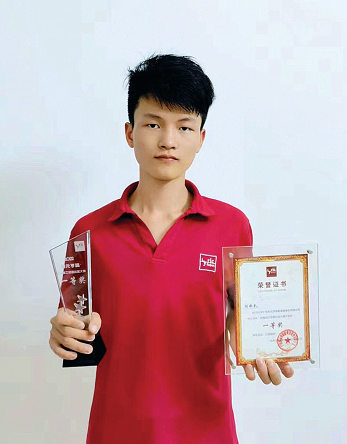 畢業(yè)時,眾多企業(yè)進校園選才,劉偉東因表現(xiàn)優(yōu)秀成功入職廣東利元亨智能裝備股份有限公司。剛開始就從學徒做起,他踏實肯學,很快就完成學徒、師傅、組長三級晉升,“在公司22歲做組長的人比較少。有時別人解決不了的難題,我解決了,那時候還挺有成就感!彼啻卧诠九e行的各類技能比賽中獲獎,比如2020年獲得分公司第一屆技能比武大賽第一名,2021年獲得公司數控技能比武大賽三等獎,2022年8月獲得公司機械加工技能比武大賽一等獎。