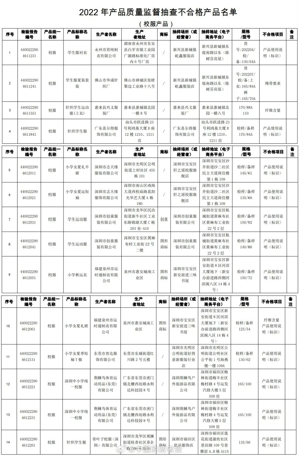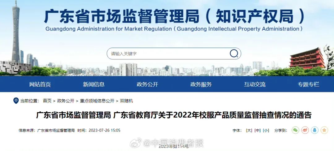 公布2022年校服產(chǎn)品質(zhì)量監(jiān)督抽查情況