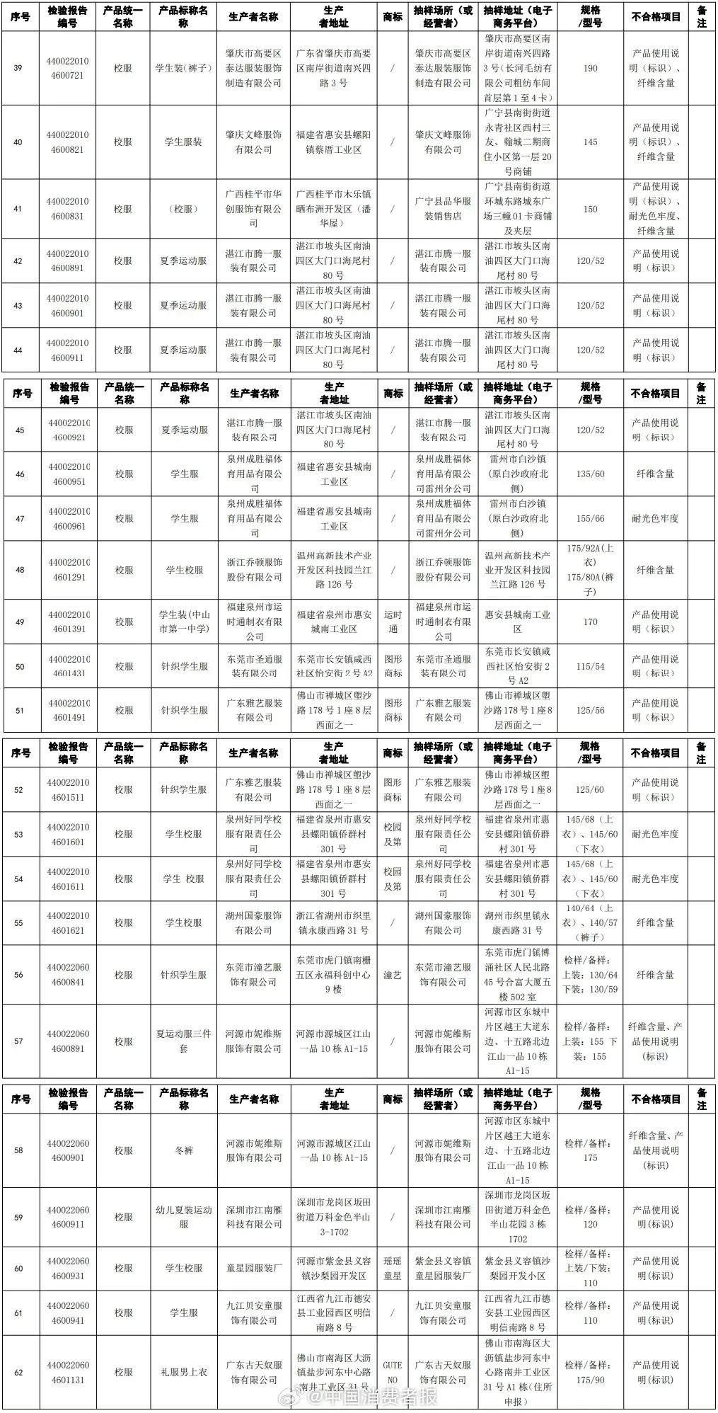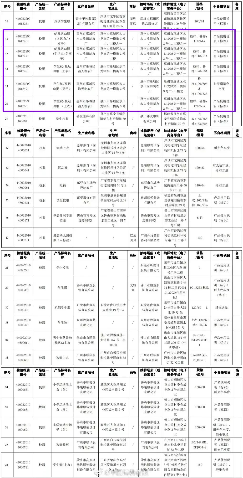 涉及惠州2家制衣廠、5款校服