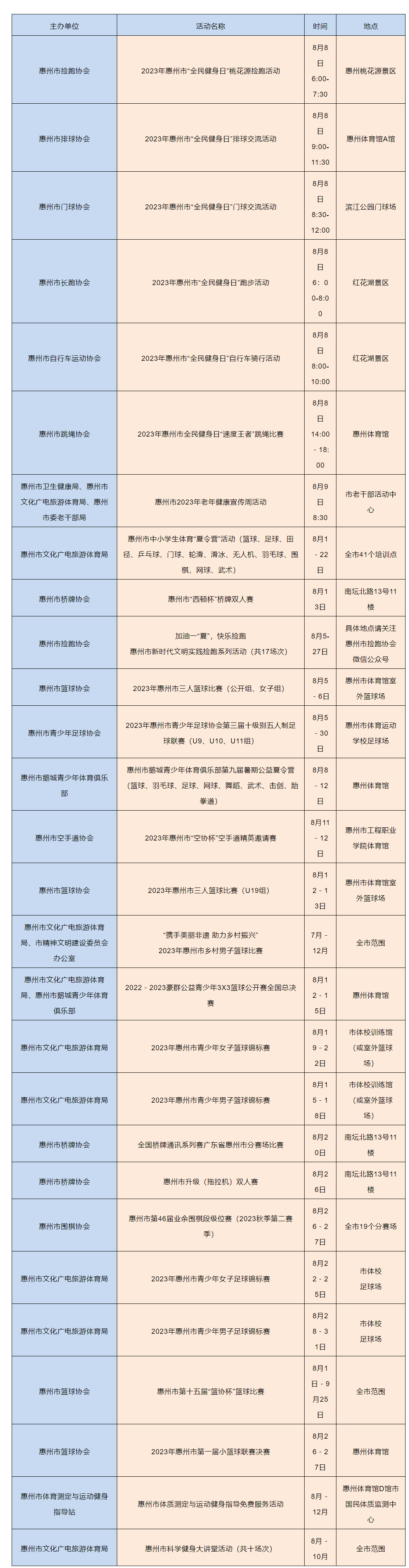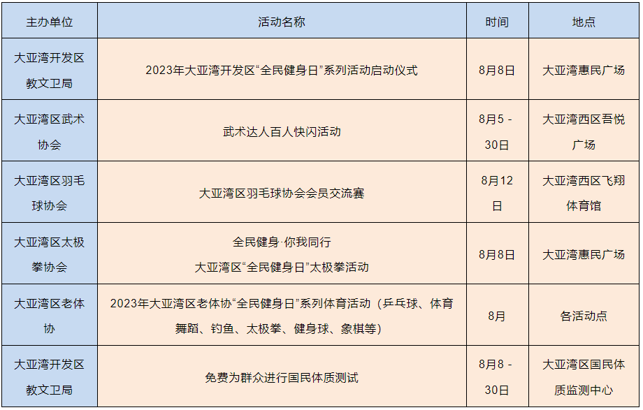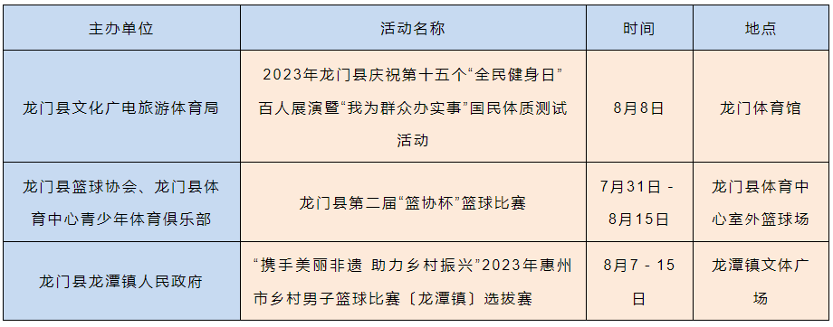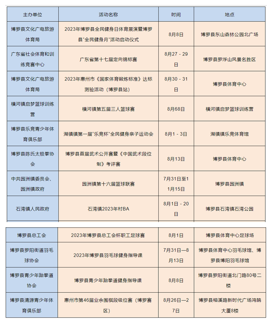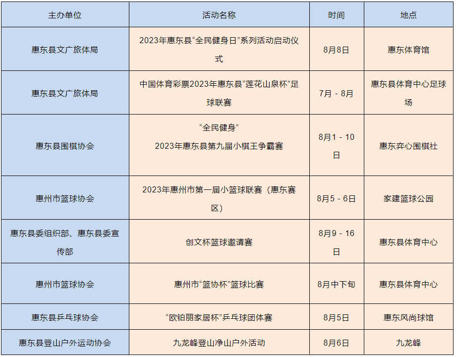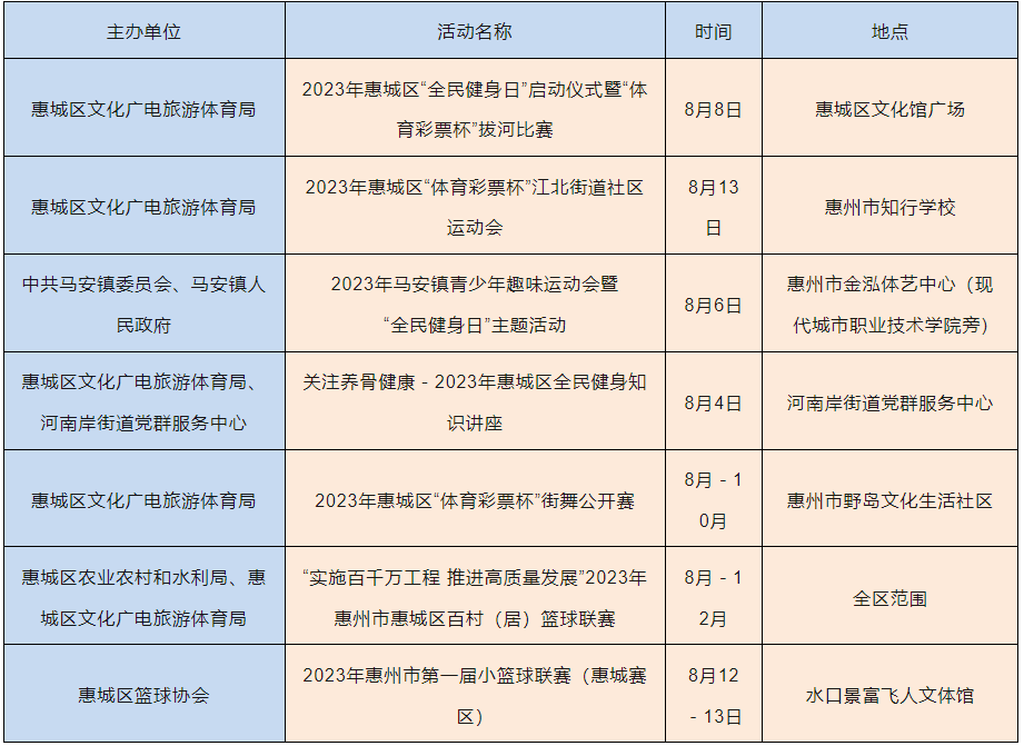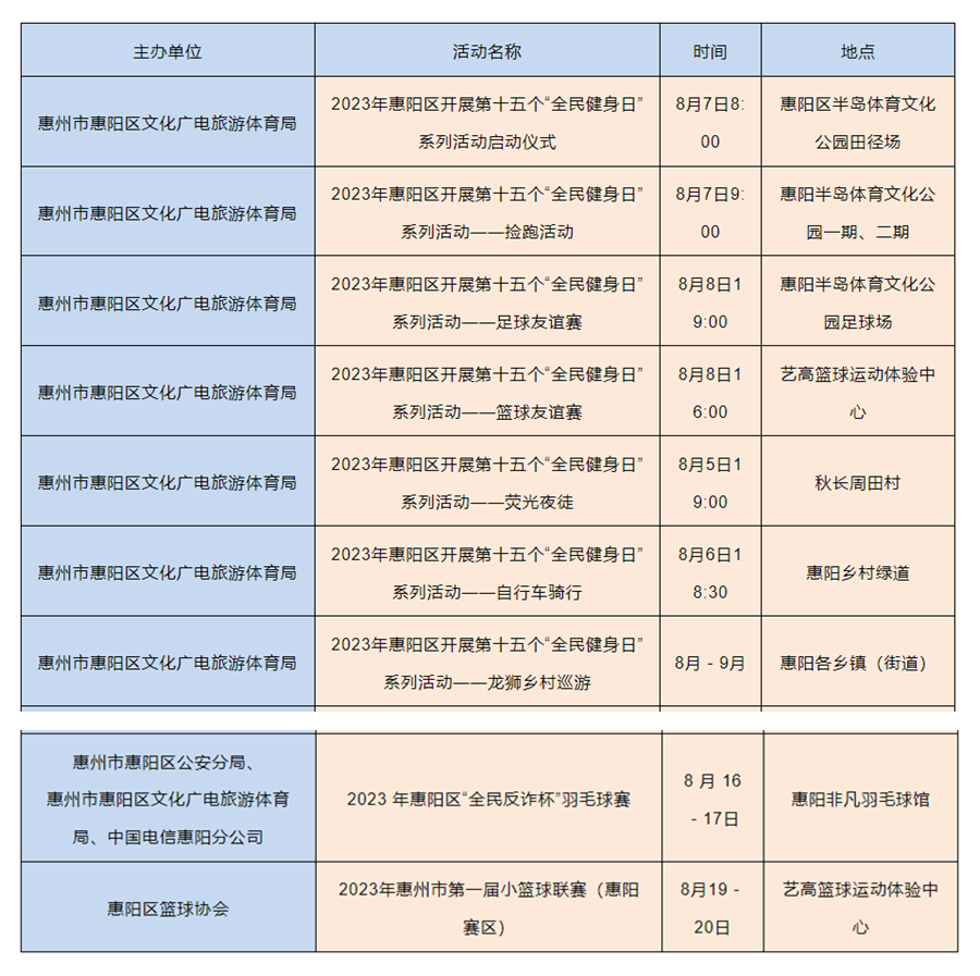 2023年8月8日是我國(guó)第15個(gè)“全民健身日”,8月8日所在周(8月7日至13日)是我國(guó)第一個(gè)“體育宣傳周”。記者從市文廣旅體局獲悉,8月8日前后,我市將以“全民健身 繪就幸福生活”為主題舉辦一系列體育賽事活動(dòng)。整個(gè)8月,將會(huì)有100多高品質(zhì)體育賽事活動(dòng)輪番上演,賽事內(nèi)容涵蓋了足球、籃球、登山、徒步、自行車(chē)等廣大市民喜聞樂(lè)見(jiàn)、踴躍參與的項(xiàng)目。同時(shí),我市還將開(kāi)展撿跑公益志愿服務(wù)和科學(xué)健身指導(dǎo)活動(dòng),用豐富多彩的健身展演、健身服務(wù)和賽事活動(dòng)把健康、快樂(lè)送進(jìn)千家萬(wàn)戶(hù),讓惠州市民充分感受到全民健身的濃厚氛圍。