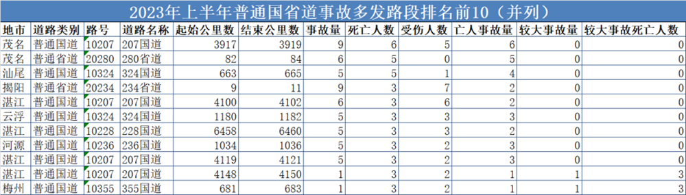 普通國省道方面,十大事故多發(fā)路段包括茂名市207國道(3917公里至3919公里處)、茂名市280省道(82公里至84公里處)、汕尾市324國道(663公里至665公里處)、揭陽市234省道(9公里至11公里處)、湛江市207國道(4100公里至4102公里處)、云浮市324國道(1180公里至1182公里處)、湛江市228國道(6458公里至6460公里處)、河源市236國道(1034公里至1036公里處)、湛江市207國道(4119公里至4121公里處)、湛江市207國道(4148公里至4150公里處)、梅州市355國道(681公里至683公里處)等上述路段。