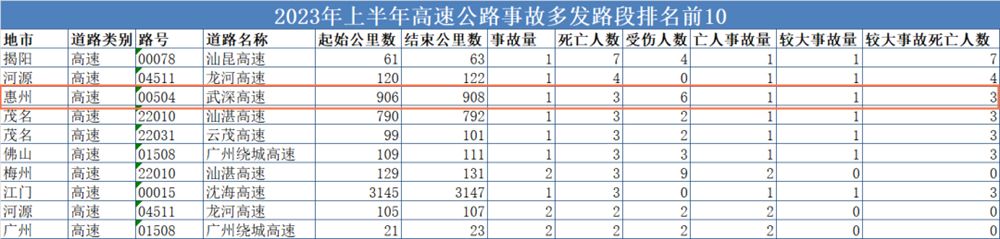 高速公路方面,十大事故多發(fā)路段包括汕昆高速揭陽段(61公里至63公里處)、龍河高速河源段(120公里至122公里處)、武深高速惠州段(906公里至908公里處)、汕湛高速茂名段(790公里至792公里處)、云茂高速茂名段(99公里至101公里處)、廣州繞城高速佛山段(109公里至111公里處)、汕湛高速梅州段(129公里至131公里處)、沈海高速江門段(3145公里至3147公里處)、龍河高速河源段(105公里至107公里處)、廣州繞城高速廣州段(21公里至23公里處)共10個路段。