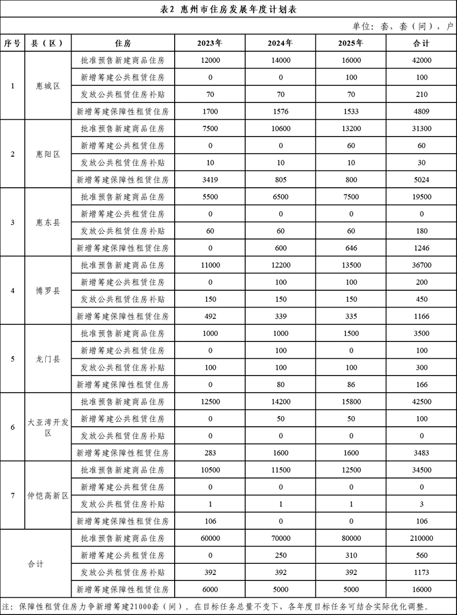 該規(guī)劃意見稿指出,在未來兩年內,惠州市擬批準預售新建商品住房21萬套左右,招拍掛供應住宅用地265公頃左右;新增籌建公共租賃住房560套,發(fā)放租賃補貼1173戶,新增籌建保障性租賃住房不少于16000套(間),力爭達到21000套(間);住房公積金新開戶職工人數34.25萬人,住房公積金新增繳存額170.86億元,切實有效地保障各階層市民在惠安居。