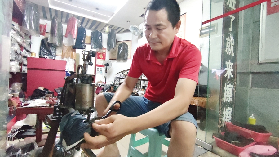 “叫美鞋吧,一是聽起來比較潮流嘛,二來也是想讓人家知道,我們不只是修鞋,還可以給鞋子做‘美容’護理!比f維群說,有個店鋪,會增加顧客的信任度,也更容易獲得穩(wěn)定客源。