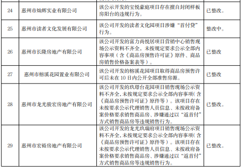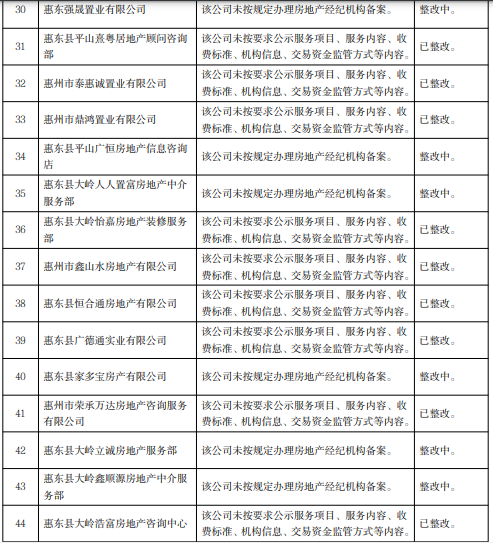 關(guān)注被通報(bào)的29家惠州企業(yè)名單,分別為惠州市讀者文化發(fā)展有限公司、惠州市龍光駿宏房地產(chǎn)有限公司等6家房地產(chǎn)開(kāi)發(fā)企業(yè)和惠東強(qiáng)晟置業(yè)有限公司、惠州市泰惠誠(chéng)置業(yè)有限公司、惠州市斌哥說(shuō)房科技有限公司等23家房地產(chǎn)中介機(jī)構(gòu)。