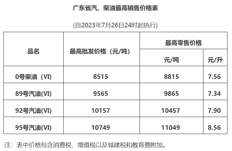 根據(jù)國(guó)家成品油價(jià)格形成機(jī)制,結(jié)合近一段時(shí)期國(guó)際市場(chǎng)油價(jià)變化情況,國(guó)家發(fā)展改革委決定自2023年8月9日24時(shí)起上調(diào)國(guó)內(nèi)成品油價(jià)格,即在現(xiàn)行價(jià)格的基礎(chǔ)上,我省汽、柴油價(jià)格每噸分別上調(diào)240元和230元。調(diào)整后,我省成品油最高銷售價(jià)格見(jiàn)下表。