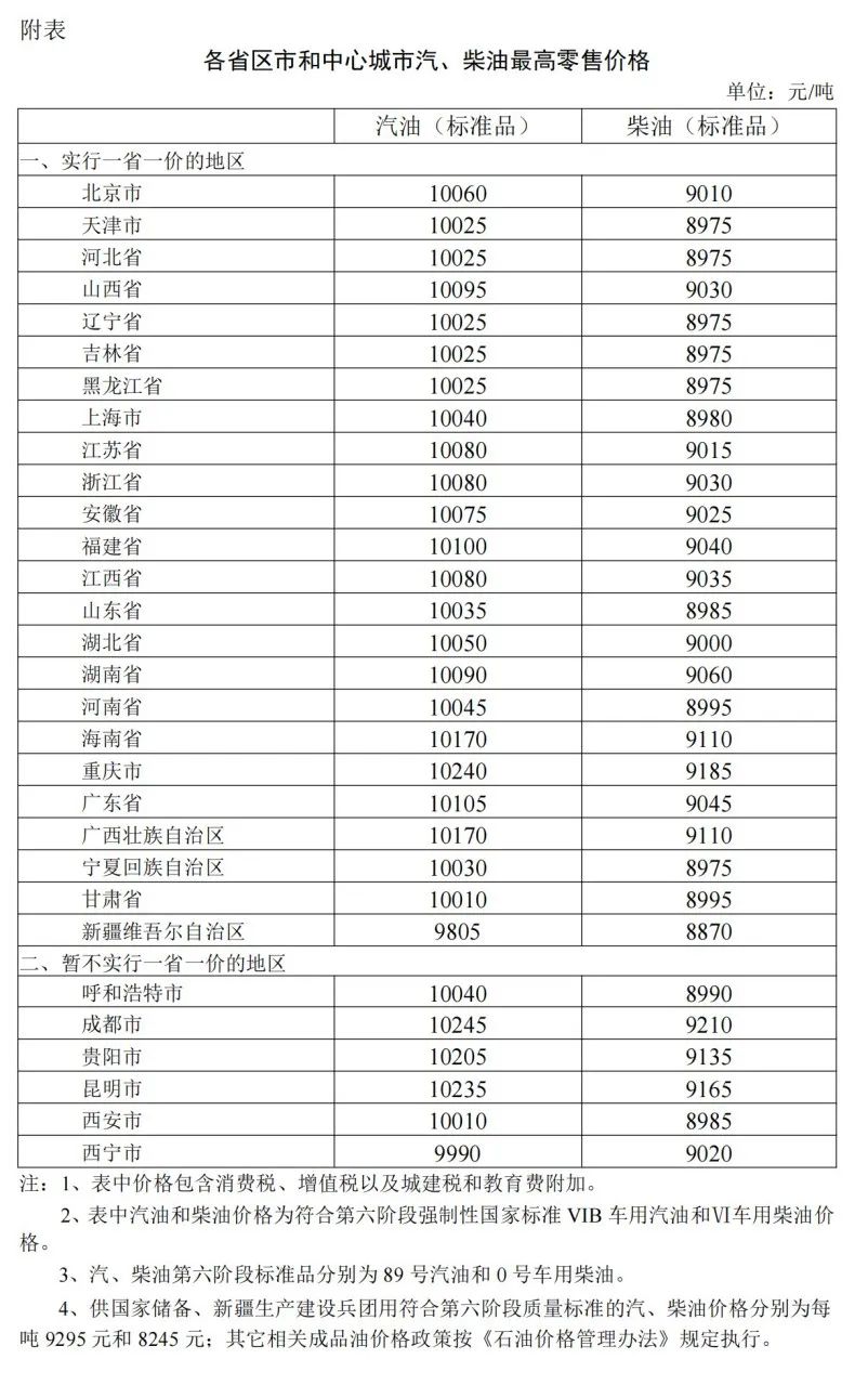 根據(jù)近期國(guó)際市場(chǎng)油價(jià)變化情況,按照現(xiàn)行成品油價(jià)格形成機(jī)制,自2023年8月9日24時(shí)起,國(guó)內(nèi)汽、柴油價(jià)格(標(biāo)準(zhǔn)品,下同)每噸分別提高240元、230元。調(diào)整后,各省(區(qū)、市)和中心城市汽、柴油最高零售價(jià)格見(jiàn)附表。相關(guān)價(jià)格聯(lián)動(dòng)及補(bǔ)貼政策按現(xiàn)行規(guī)定執(zhí)行。