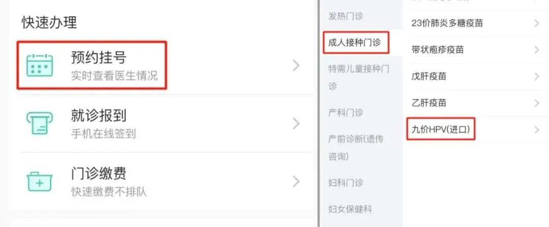 進(jìn)入惠州市第一婦幼保健院公眾號(hào):點(diǎn)擊就醫(yī)服務(wù)--在線掛號(hào)--成人接種門診--選擇九價(jià)HPV(進(jìn)口)。