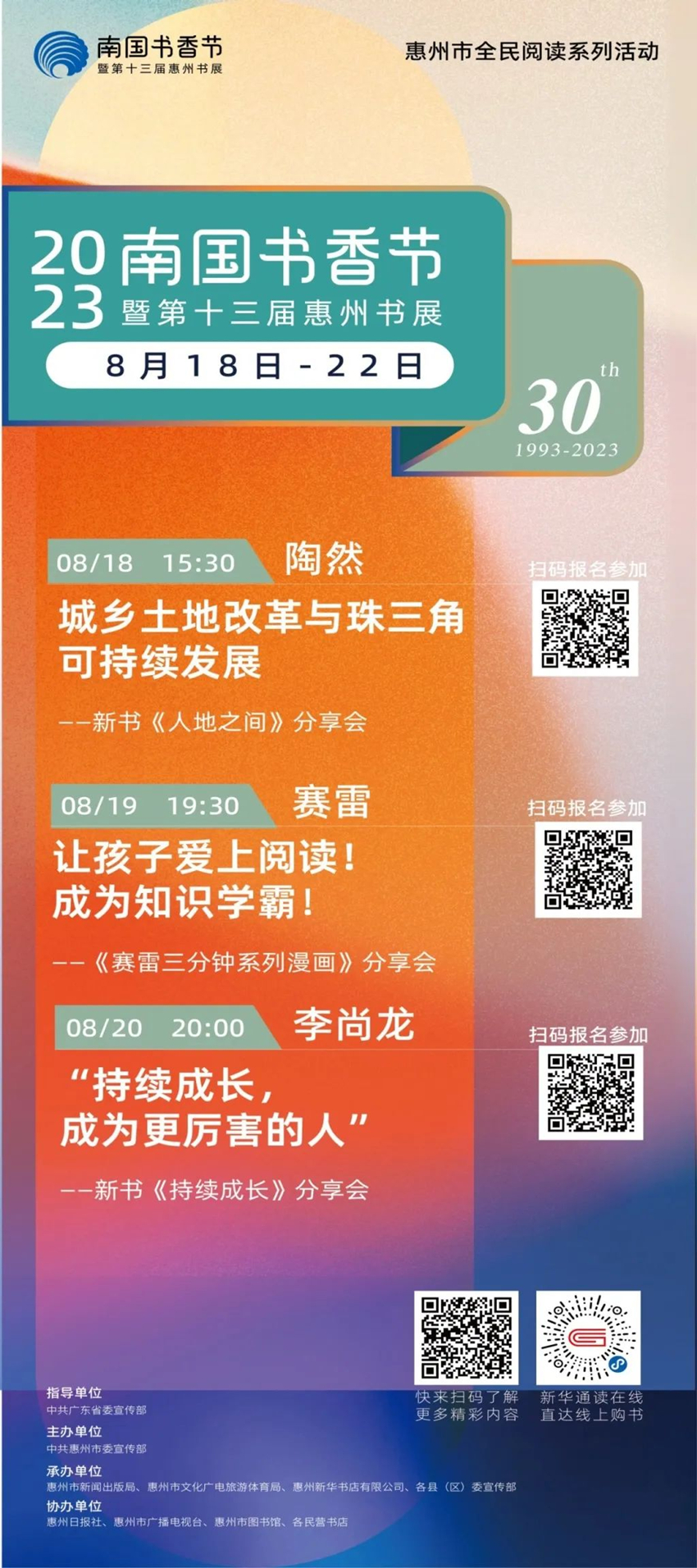 由中共廣東省委宣傳部指導,中共惠州市委宣傳部主辦的2023南國書香節(jié)暨第十三屆惠州書展即將于8月18日開幕,展期5天,將通過線上線下的形式舉行近百場各類全民閱讀活動,營造“書香滿城,全民閱讀”氛圍。