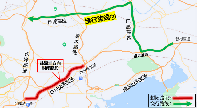 繞行路線②:由凌坑互通,轉(zhuǎn)廣惠高速、甬莞高速往深圳方向(見(jiàn)圖2)。